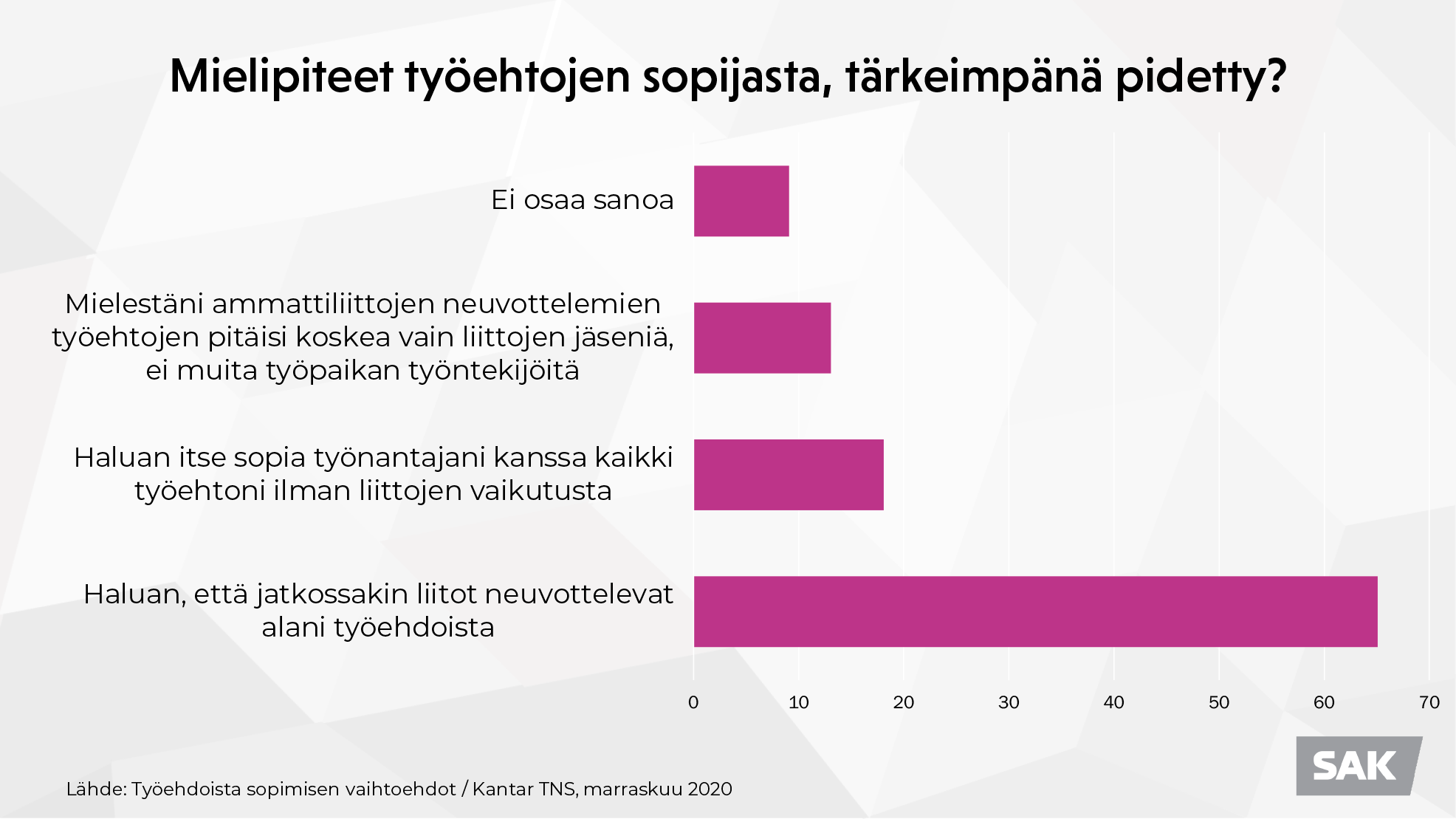 Nykyisessä mallissa työehtosopimukset ovat toimineet kuin rokotteiden antama laumasuoja, sillä ne koskevat myös niitä yrityksiä (ja työntekijöitä), jotka eivät kuulu liittoon. Vaikka yleissitovat työehtosopimukset jäisivätkin historiaan, ei järjestäytymisen merkitys katoa mihinkään, päinvastoin.