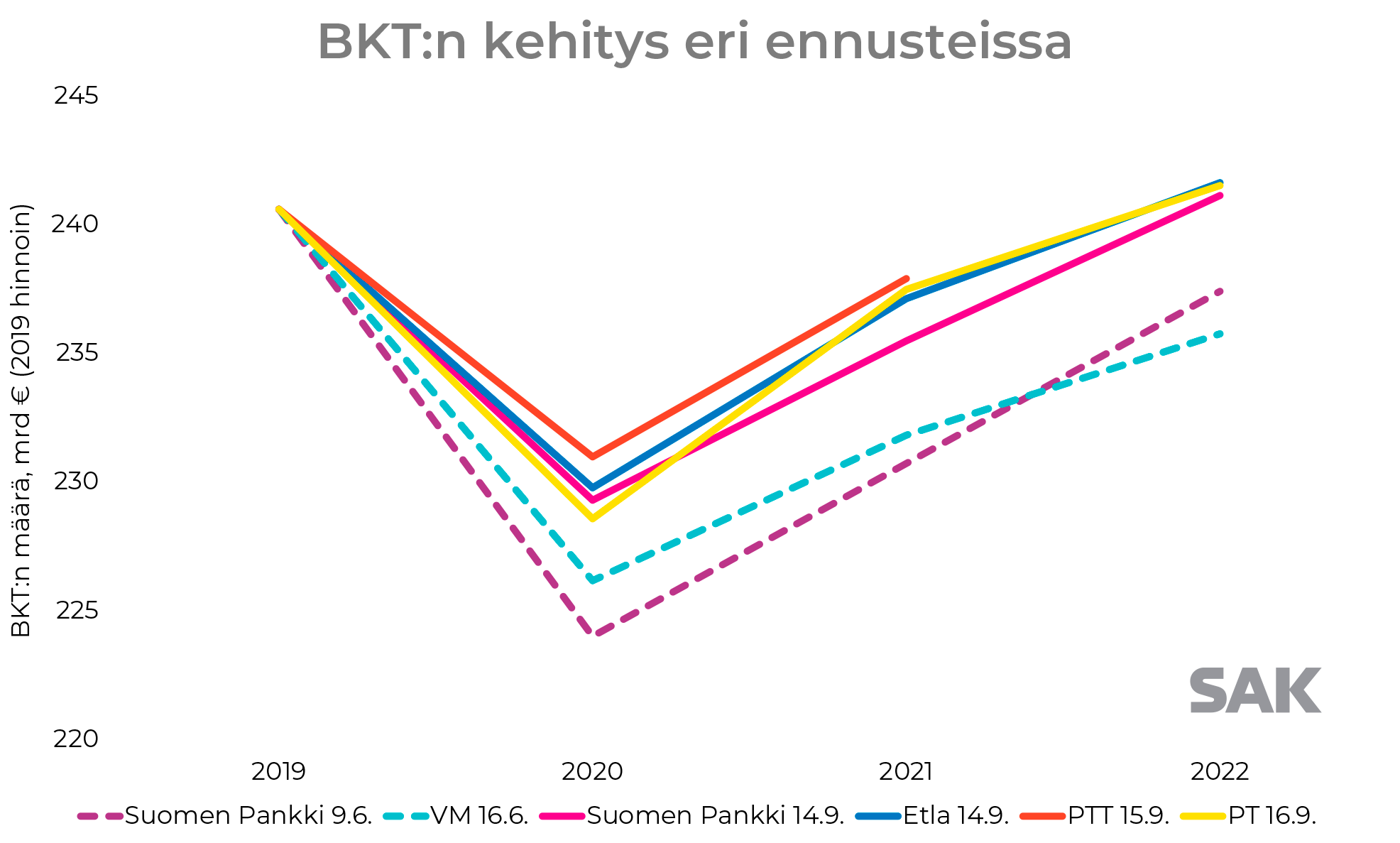 Talouden suuri kuva on pysynyt toki samana siinä mielessä, että koronakriisi supistaa taloutta rajusti tänä vuonna ja siitä elvytään ensi vuonna vain osittain, mutta ilmiön mittakaava on muuttunut parempaan suuntaan. Siinä missä kesällä odotettiin talouden sukeltavan syvälle ja kuopan umpikuromisessa menevän vuosia, niin nyt talouden ennustetaan elpyvän viime vuotta korkeammalle tasolle jo vuonna 2022. Näkymä on edelleen huono, mutta paljon vähemmän huono kuin mitä muutama kuukausi sitten pelättiin.
