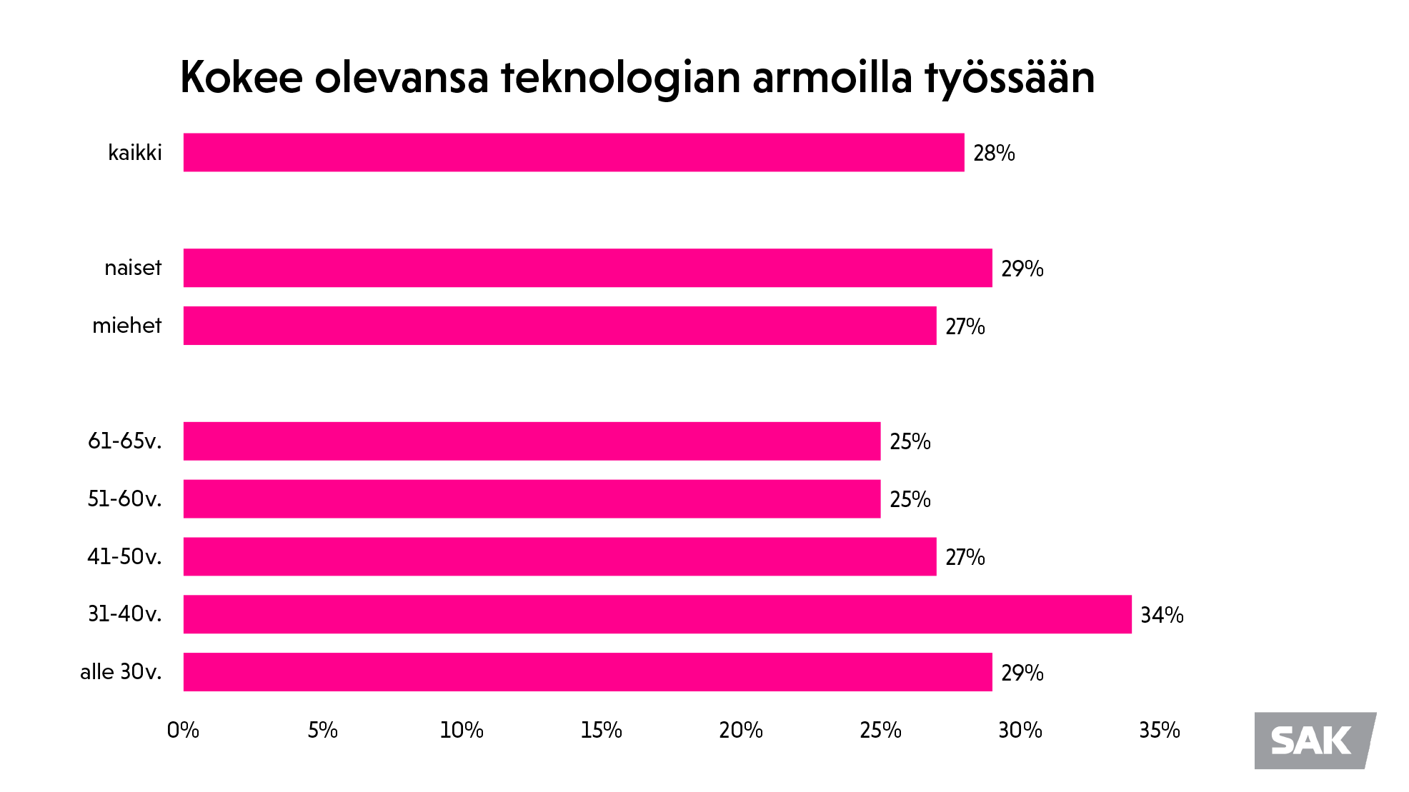 Tämä ei enää päde. Teknologian kehitys muuttaa tehtävien sisältöjä sellaisella vauhdilla, etteivät kaikki tahdo pysyä mukana. 28 prosenttia SAK:n työolobarometrin vastaajista kokee olevansa teknologian armoilla työssään. Mielenkiintoista oli, että erityisesti 30–40-vuotiaat olivat tätä mieltä.