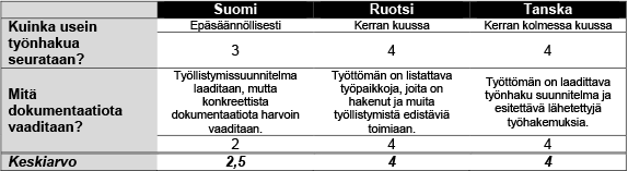 Työnhaun seuranta on Suomessa kiistatta vähäisempää kuin Ruotsissa ja Tanskassa, ja OECD:n arviointi kuvastaa tätä hyvin. Tältä osin Suomen järjestelmään on ehkä tulossa muutos hallituksen kaavailemien työttömien haastatteluiden myötä. Jos se toteutuu, niin työnhaun seurannan tiheyden osalta Suomen pisteytys nousisi 3:sta 4:ään, jolloin työnhaun seurannan osalta keskiarvo nousisi 2,5:stä 3:een.