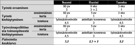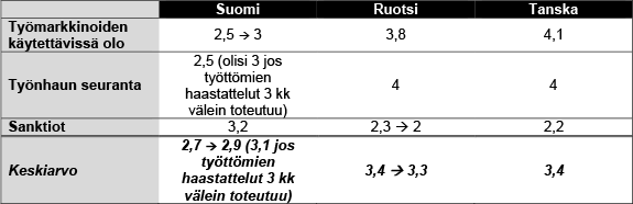 Työmarkkinoiden käytettävissä olon näkökulmasta maita erottavat lähinnä Suomen kolmen kuukauden ammattitaitosuoja ja oikeus kieltäytyä työstä työllistymistä edistävän koulutuksen aikana. Näitä Suomen sallimia lievennyksiä työn vastaanottovelvoitteeseen voi mielestäni pitää työmarkkinoiden toiminnan kannalta järkevinä.