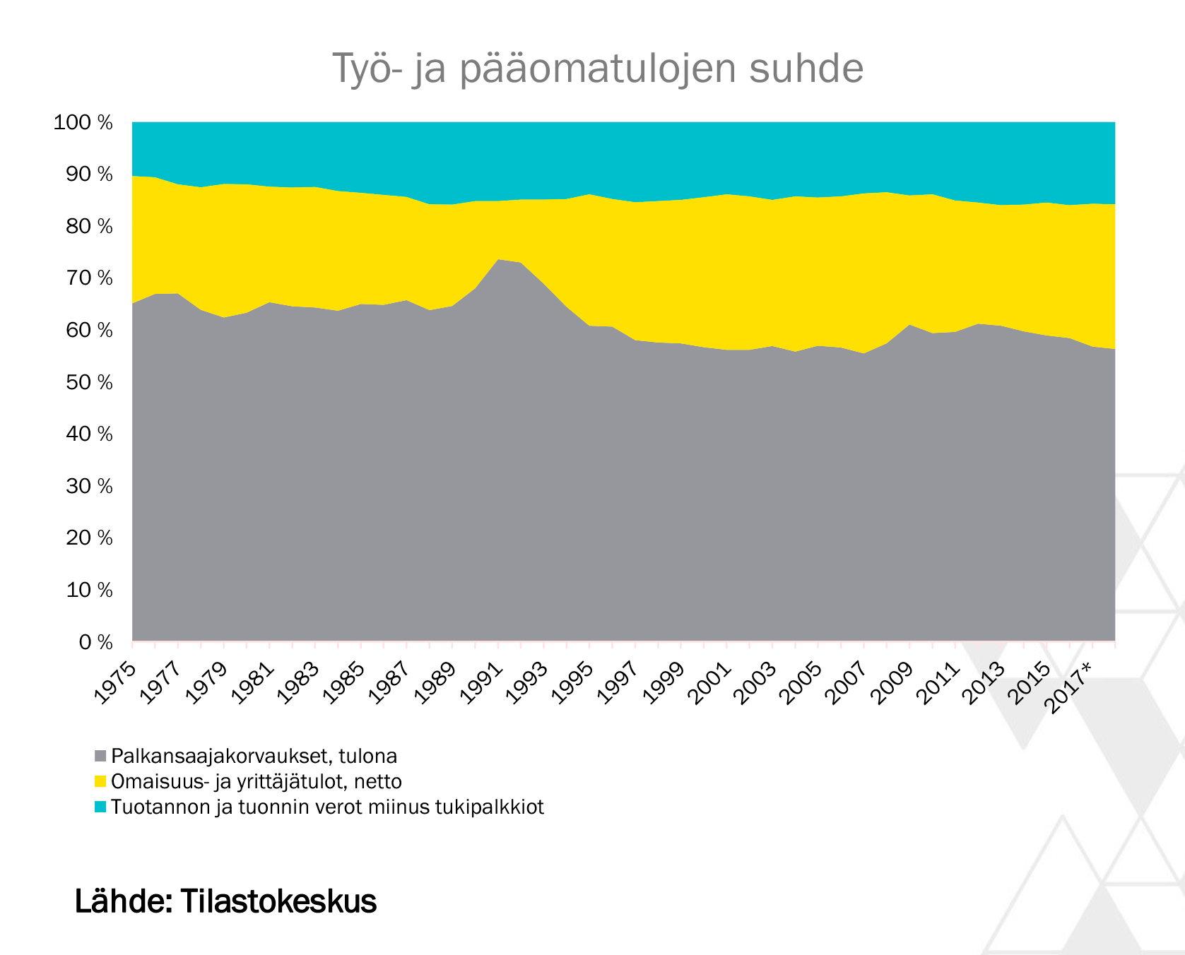 Suomessakin tulonjako kääntyi voittojen hyväksi 1990-luvun puolivälissä. Kehitys ei ole ollut kuitenkaan yhtä dramaattinen kuin muualla maailmassa. Tämä jatkui myös talouskriisin jälkeen. Vaikka talous kävi välillä taantumassakin, on voittojen osuus ollut viime vuosina yhtä korkea kuin 1980-luvun nousukaudella. Palkkojen osuus on edelleen pienentynyt vuoden 2013 jälkeen, vaikka talous ei ole ehtinytkään paljoa kasvaa. Suomessa tuloerot ovat kasvaneet noin 5,5 prosenttiyksikköä vuosien 1990–2017 aikana.