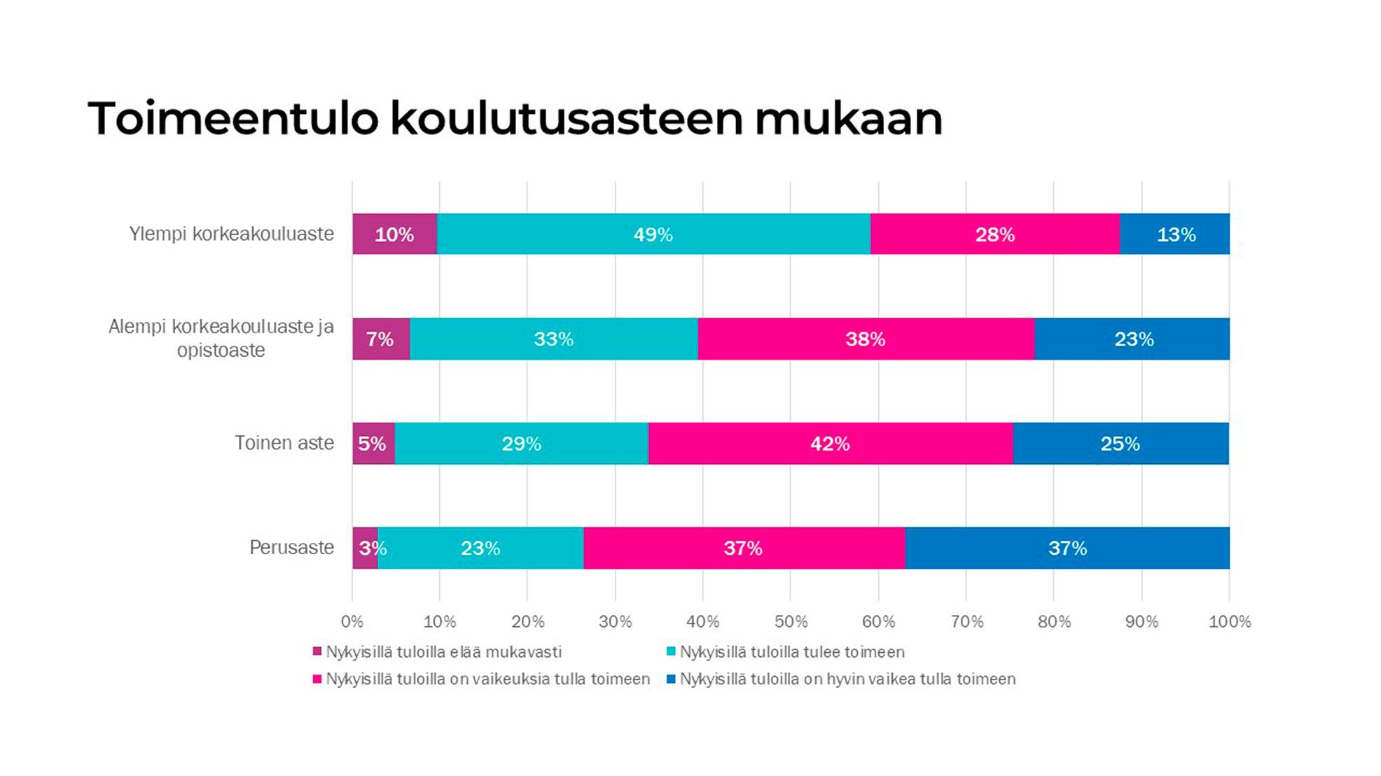Myös toimeentulo-ongelmat näyttävät kasaantuvat varsinkin perusasteen varassa oleville. SAK:n tutkimuksessa perusasteen varassa olevista 74 prosenttia kertoo, että tuloilla on vaikea tai erittäin vaikea tulla toimeen. Lisäksi ulosottovelasta kertoo jopa 58 prosenttia perusasteen varassa olevista.