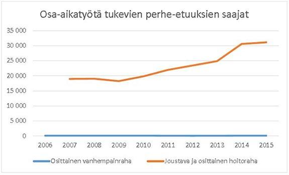 Kyselyiden perusteella perheet haluavat perhevapaamalleja, jotka tukevat osa-aikatyötä. Siitä huolimatta osittaista vanhempainrahaa käyttää vuosittain vain noin sata perhettä, eli 0,07 prosenttia perhe-etuuksia nostavista perheistä.