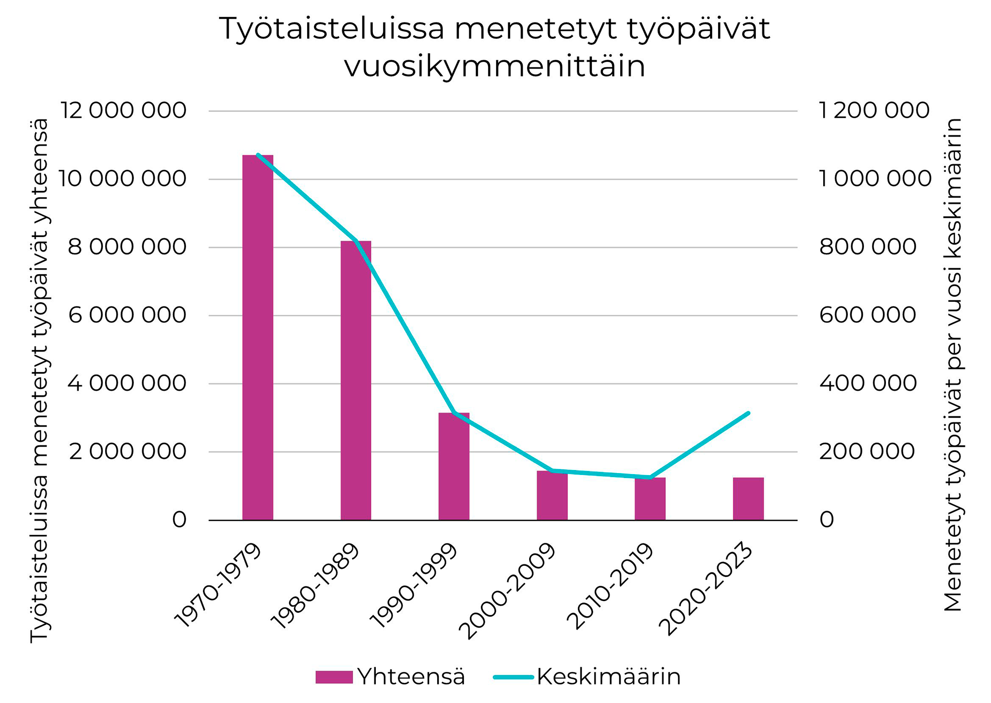 Tämän vuosikymmenen ensimmäisen neljän vuoden aikana työtaisteluissa on jo menetetty melkein yhtä paljon työpäiviä kuin viime vuosikymmenenä yhteensä. Kun vuosikymmen ei ole vielä puolivälissäkään ja tilastossa ei ole mukana tämän kevään laajat poliittiset työtaistelut, niin on selvää, että 2020-luku tulee olemaan tilastohistorian ensimmäinen vuosikymmen, jossa työtaisteluiden määrä on kasvanut edellisestä. Työtaistelutilastojen vuosikeskiarvo on ollut 2020-luvun alkupuolella 1990-luvun tasolla.