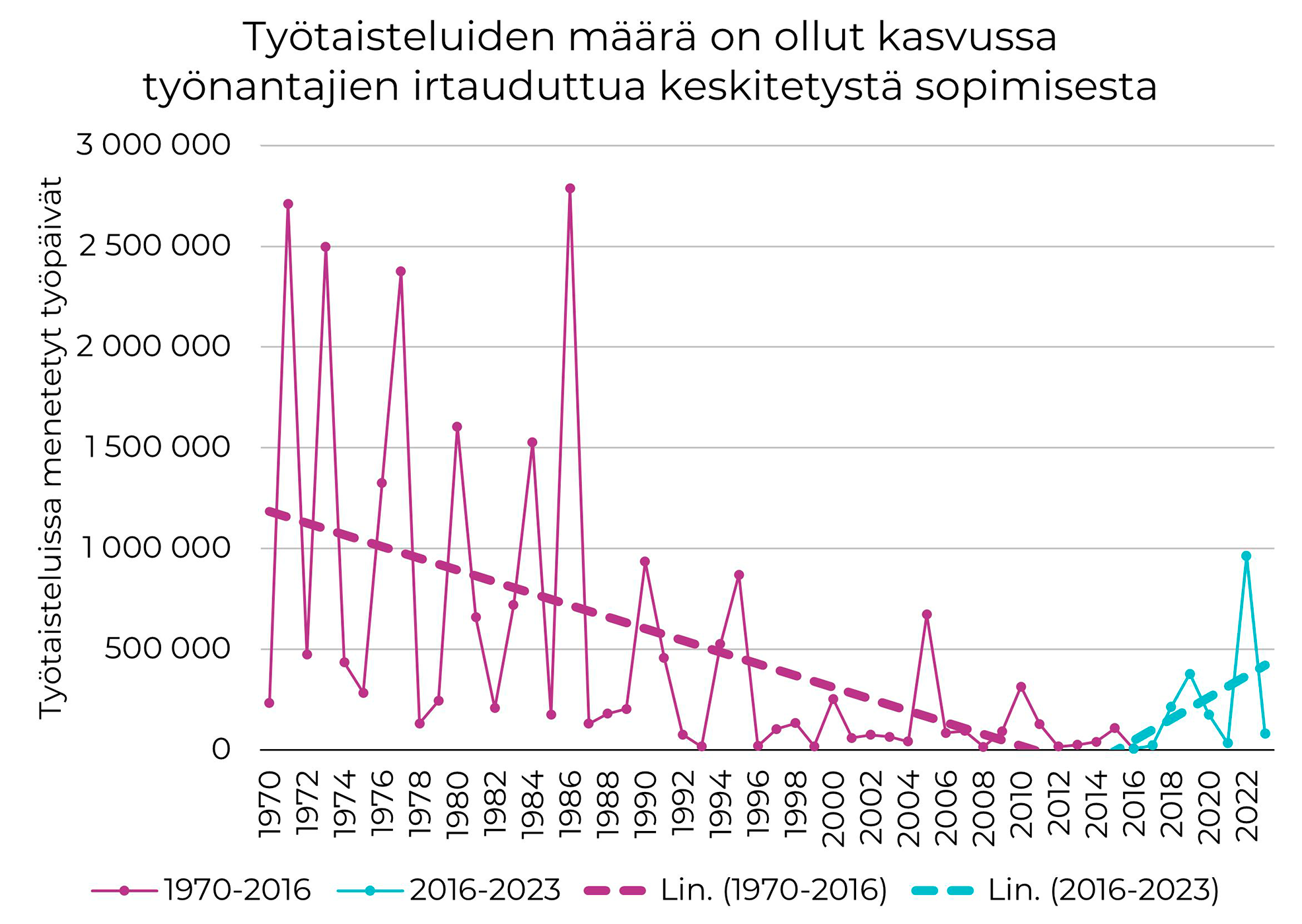 Ajattelutavan muutos ehkä konkretisoitui toiminnaksi siinä vaiheessa, kun Elinkeinoelämän keskusliitto ilmoitti lopettavansa keskitetyt palkkaratkaisut vuonna 2016 ja irtautuvansa keskusjärjestösopimuksista vuonna 2017. Nämä muutokset mullistivat työehdoista sopimisen lisäksi myös työlainsäädännön kehittämisen. Samoihin aikoihin lähti myös työtaisteluiden määrä kasvuun.