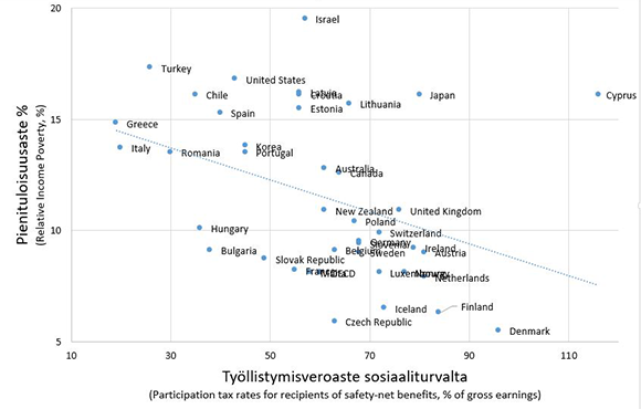 Kun samassa kuviossa tarkastelee eri maiden työnteon kannustimia ja pienituloisuutta, näkyy näiden välillä selkeä yhteys. Tässä työnteon kannustimia mitataan työllistymisveroasteella, joka on työllistyessä omaan taskuun jäävä osuus palkasta, kun otetaan huomioon työllistyessä menetetyt sosiaalietuudet ja verotus. Korkea työllistymisveroaste tarkoittaa siis heikkoja työnteon kannustimia.