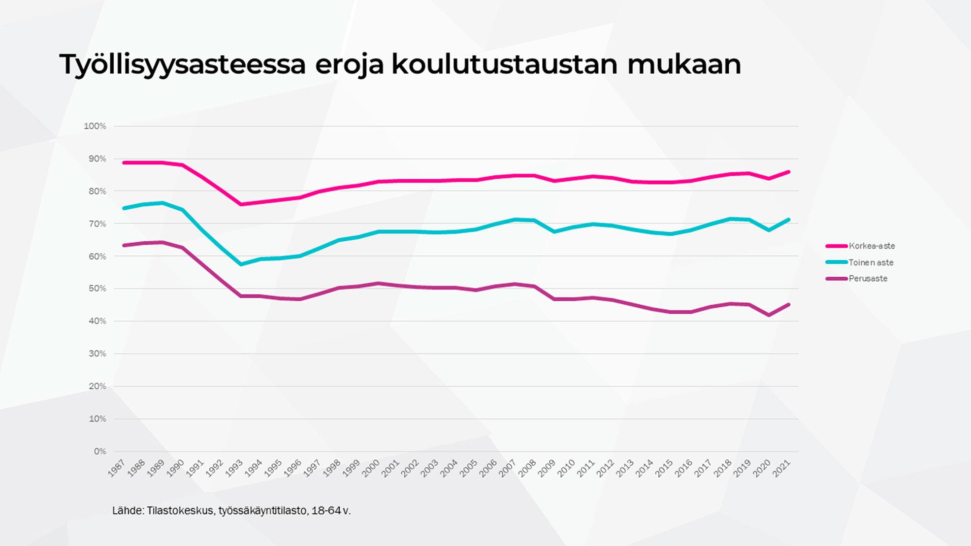 Mitä siis pitäisi tehdä? Minä aloittaisin siitä, että kaikille työnhakijoille on tarjolla kunnon palveluita työnhakuun ja työkyvyn ongelmiin tartutaan heti työttömyyden alussa. Toiseksi lisäisin voimakkaasti peruskoulun varassa olevien koulutusta, koska heidän työllisyysasteensa on nyt vain reilut 40 prosenttia. SAK:n selvityksessä toimeentulon ja terveyden ongelmia on erityisesti vähemmän koulutetuilla.