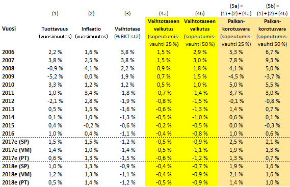 Alla olevassa taulukossa on esitetty vaihtotaseen huomioiva palkankorotusvara. Laskelmassa on käytetty 25 %:n ja 50 %:n sopeutumisvauhtia, eli joko neljännes tai puolet vaihtotaseen epätasapainosta on tarkoitus kuroa kiinni vuodessa (sopeutumisvauhdiksi voitaisiin tietenkin valita mikä tahansa muukin luku 0–100 %:n väliltä). Lisäksi joustona on käytetty 0,64 (tuonnin jousto 0,41 ja viennin jousto -0,23) 3).