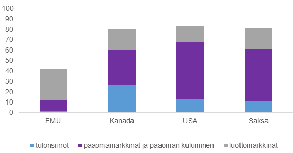 Kuviosta ilmenee, että erityisesti USA:n ja Saksan osavaltioiden apuna on tulonsiirtojen lisäksi hyvin integroituneet finanssimarkkinat. Kun taantumassa yritysten tulokset heikkenevät, työttömyys kasvaa ja palkkakehitys hidastuu, eivät tulot alene pelkästään yrityksen sijaintiosavaltiossa, vaan laajemmin koko liittovaltiossa. Yritysten omistajat ja rahoittajat sijaitsevat monesti muissa osavaltioissa. Lisäksi työvoiman liikkuvuus osavaltioiden välillä auttaa pitämään työmarkkinat tasapainossa.