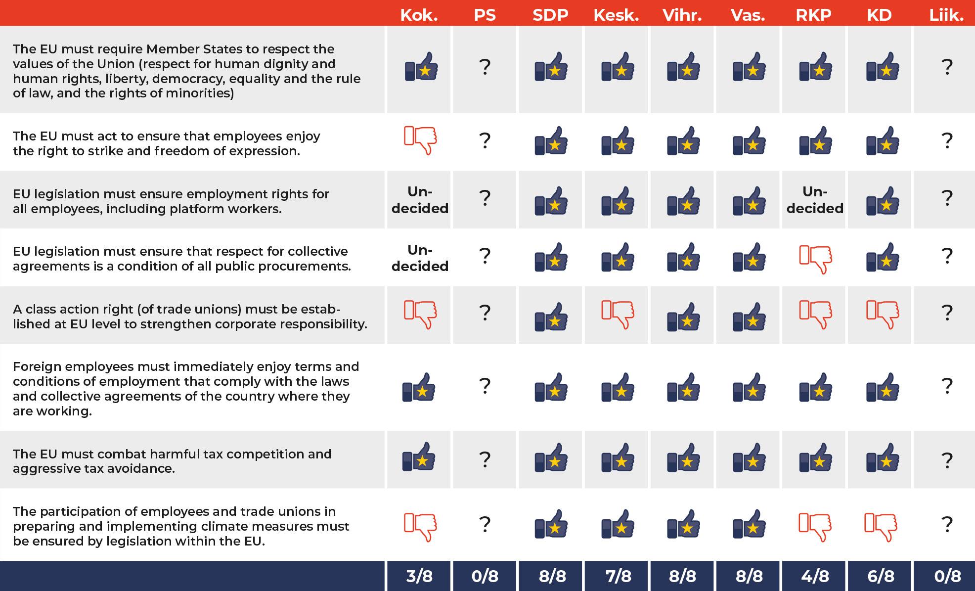 Political developments in Finland have given us serious grounds for voting in European elections. SAK has surveyed the attitude of political parties to issues at EU level that are crucial to employees.