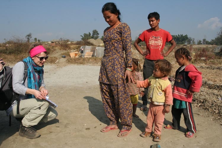 Talkoresenären Jenni Sjöman från JHL visar bilder från Finland för en familj som jobbar vid en tegelfabrik utanför Nepals huvudstad Katmandu.