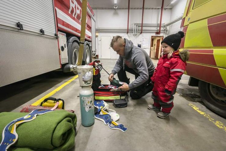 Kunskaperna i den första delvården måste uppdateras regelbundet. Ambulansens utrustning intresserar också dottern Moa.