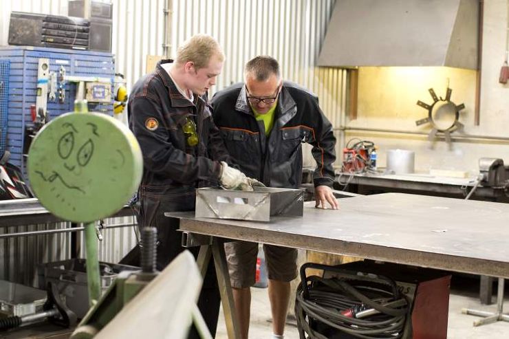 Arbetslivstränaren Markku Kolari (t.h.) lär ut metallarbete på verkstaden Vattipaja i Laukas. Här handleder han Jonne Peltomaa.