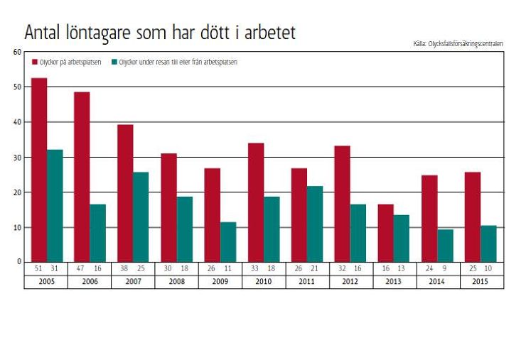Antalet personer som har dött i olyckor på arbetsplatsen samt i olyckor på väg till eller från arbetsplatsen. Grafik: Paula Winter
