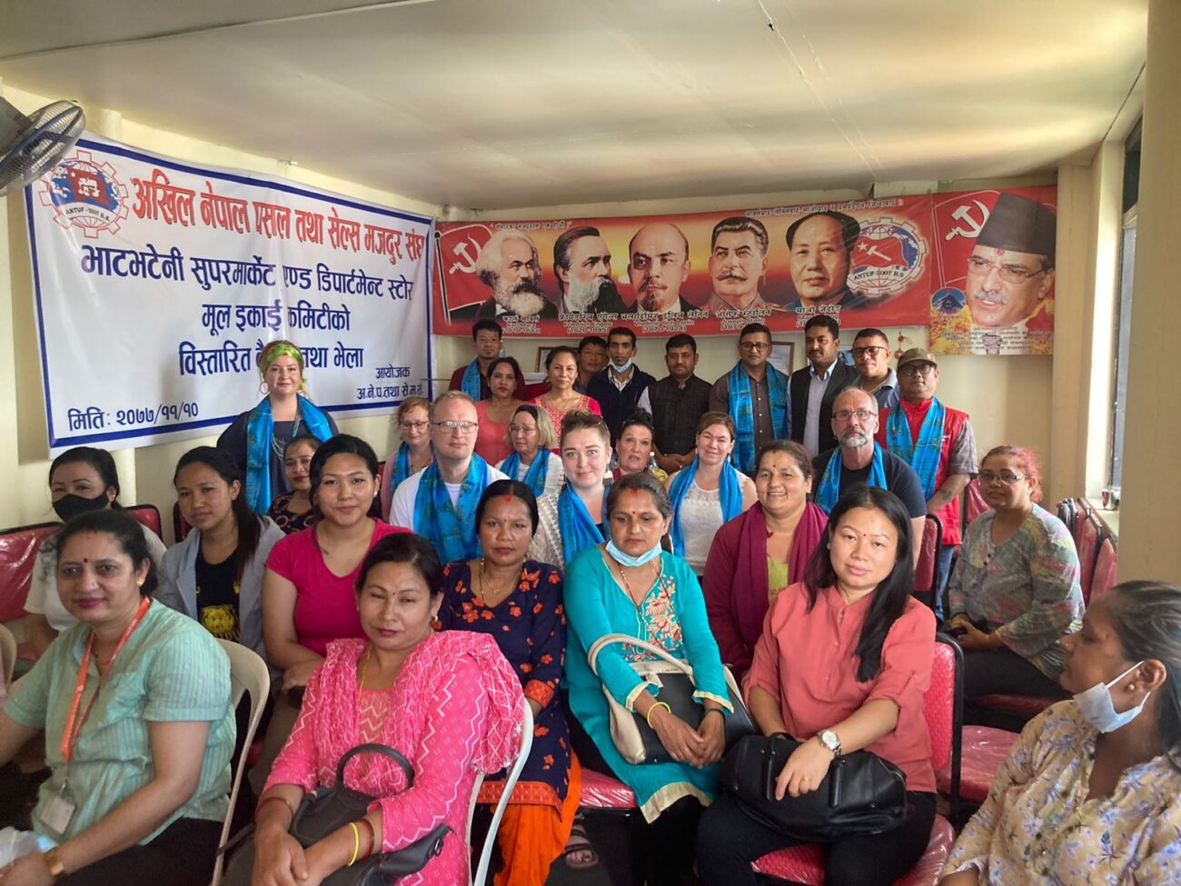 Vi befinner oss i ett klubbrum för arbetstagarna på den nepalesiska supermarketkedjan Bhatbhateni. Under banderollen med socialismens lärofäder och de som omsatte läran i praktiken sitter lika många ledare för den nepalesiska fackföreningsrörelsen. Dessutom strömmar det hela tiden in medlemmar i rummet.