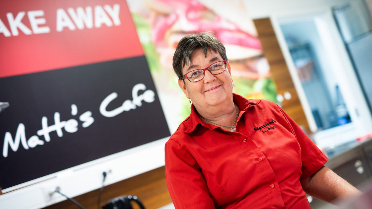 Ing-Mari Heikfolk är ett känt ansikte på Mattssons i Godby efter 30 år på samma arbetsplats. Sedan ett par år tillbaka jobbar hon i kaféet som är en populär träffpunkt på norra Åland. Foto: Kjell Söderlund