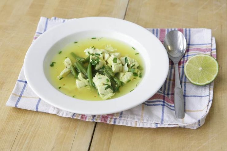 Fräs upp gurkmeja, chiliflakes och vitlök i en skvätt olja i kastrullen. Tillsätt buljongen. Skär fisken i mindre bitar. Pressa över limesaft och strö över salt. Låt stå kallt en stund. Ansa bönorna och låt koka 3–4 minuter i buljongen. Pressa ner vitlöken. Klipp gräslök och koriander. Tillsätt fisken och låt soppan sjuda tills fisken är klar. Det tar några minuter. Rör ner det kryddgröna. Smaka av. Servera med ett gott bröd.