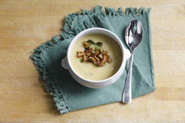 Ansa svampen och stek den torr i het panna tillsammans med lite av löken. Smaka av soppan och toppa portionerna med svampen och lökblandningen.