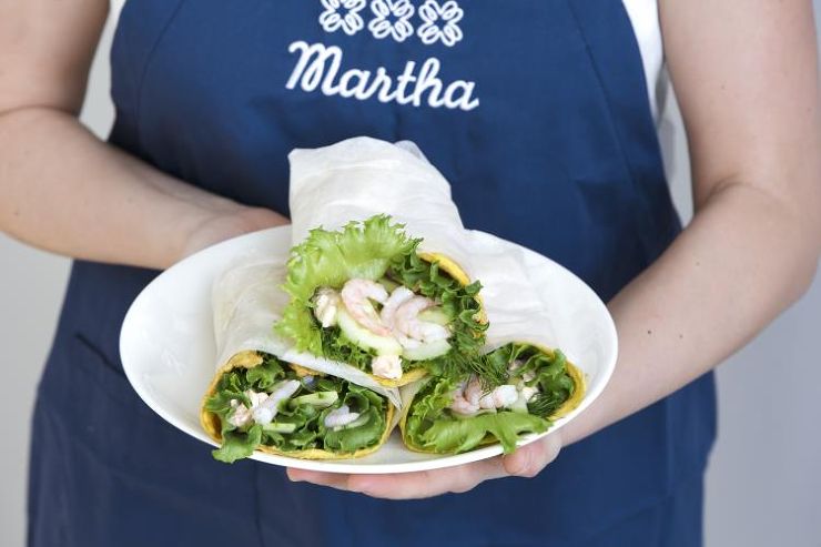 Bred sedan ut ärtkrämen på de avsvalnade omeletterna. Lägg på salladsbladen samt fisk- och räkröran. Vik ihop och paketera i smörpapper.