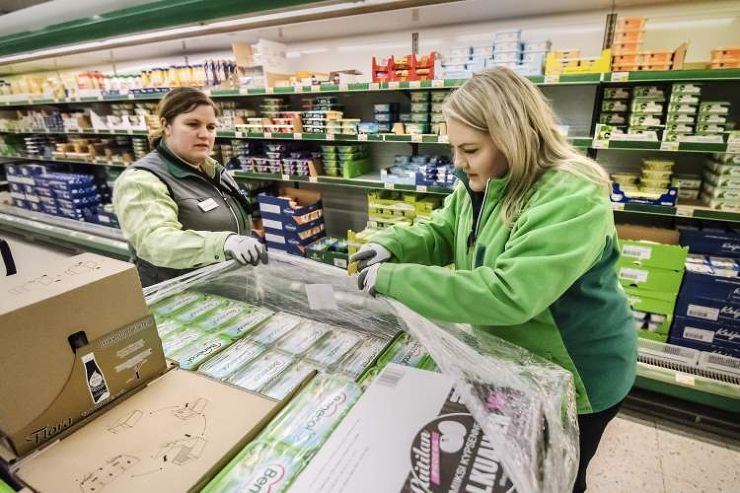 Leena Kuusisto är min mentor och hon ansvarar för avdelningen. Hon har redan hunnit vara på jobb i en timme och verkar inte det minsta trött. Det är två timmar kvar tills hypermarketen öppnar och det finns en hel del att göra. Jag får ta på mig en grön Prisma-jacka och ett par handskar.