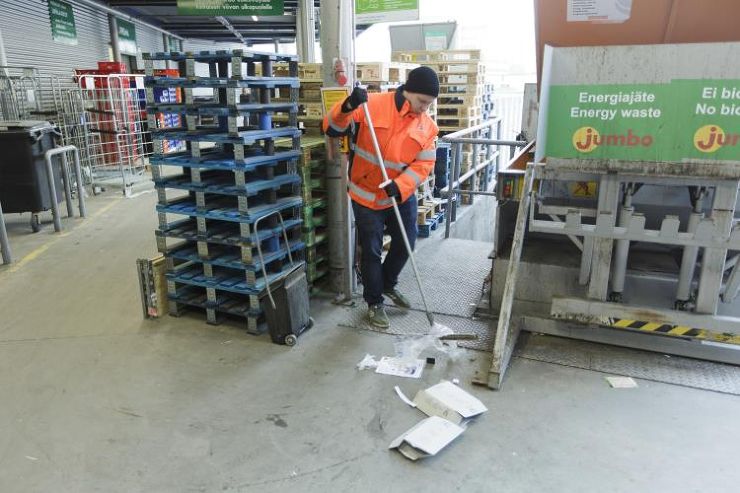Fastighetsskötaren ska hålla rent på lastningsområdet. Löntagarens reporter Johannes Waris jobbar en dag som fastighetsskötare i köpcentret Jumbo.