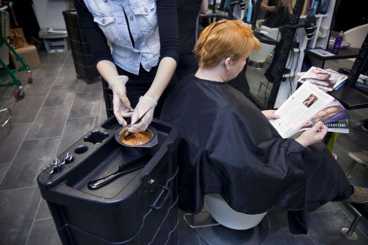 – De allra flesta frisörerna använder skyddshandskar, men det är ganska vanligt att handskarna inte används rätt. Man byter inte handskar tillräckligt ofta och man skyddar inte händerna när man tvättar eller klipper färgat hår, säger Eija Nevala som har 30 års erfarenhet av hårvårdsbranschen och i dag är riksomfattande huvudförtroendeman och arbetarskyddsfullmäktig på frisörkedjan New Hairstore.