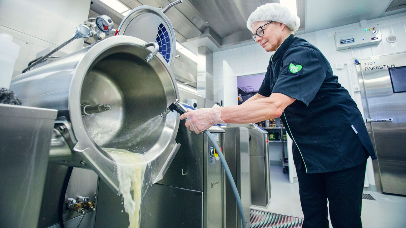 De stora kylrummen surrar dovt i måltidsföretagets distriktskök i södra Lahtis. I ett av kylrummen kyler man ned nytillredd mat. I ett annat förvaras frestelser som ännu inte gräddats. Det följande mellanlagret, där temperaturen bara är tre grader, kyler man ned tillredningskärlen inför nästa dags produktion.