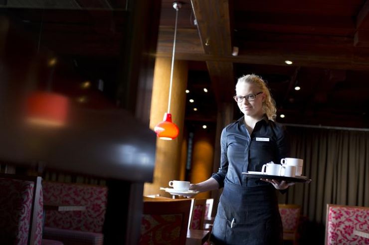 Det är en lugn måndagseftermiddag och just nu är det inte många kunder som servitrisen Suvi Kotkavuori behöver betjäna i Huviretki-restaurangen vid Cumulus-hotellet i Jyväskylä. Men det är inte alltid så här lugnt. Som servitör får man vänja sig vid att arbetstempot ofta är hektiskt.