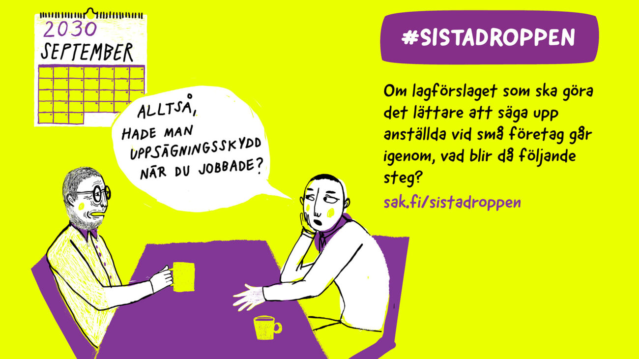 Statsminister Juha Sipiläs bereder en ändring av arbetsavtalslagen som ska göra det lättare att säga upp arbetstagare på personrelaterade grunder vid små företag. Finlands Fackförbunds Centralorganisation FFC och dess medlemsförbund har motsatt sig lagändringen från första början. Uppsägningslagen försvagar anställningstryggheten vid små företag och leder till att de som jobbar på små företag försätts i en ojämlik situation i förhållande till dem som jobbar på större företag.